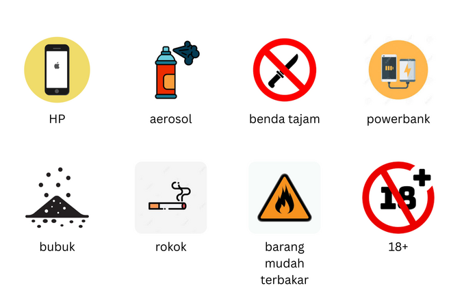 barang yang dilarang kirim: HP, aerosol, benda tajam, pure battery/ powerbank, bubuk putih, korek, rokok/ vape/ pods, pornografi