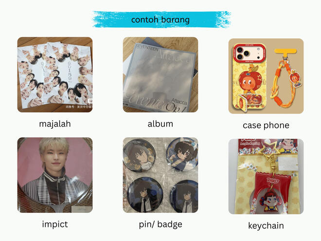 » contoh : keyring akrilik, album, majalah, baju doll, casing hp, buku, card holder pvc/ akrilik, photobook